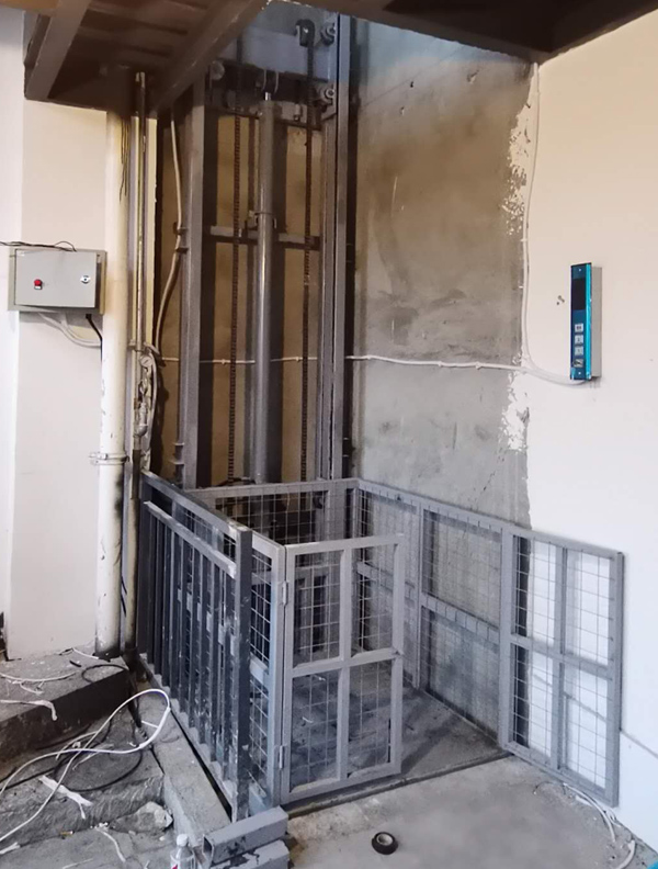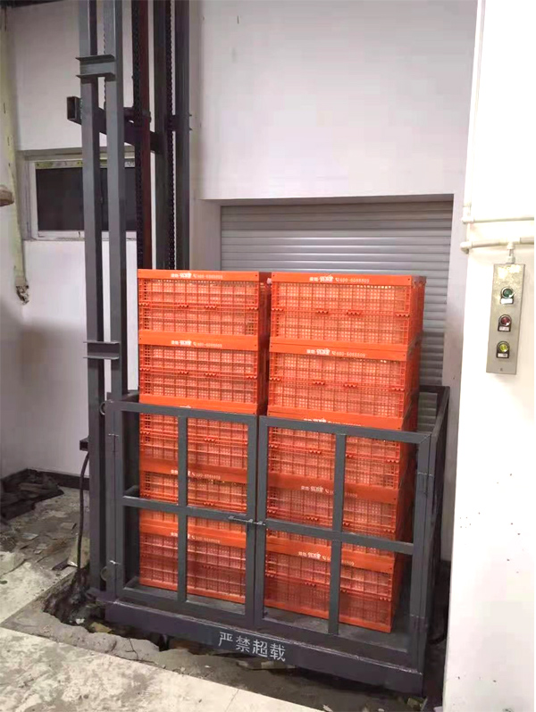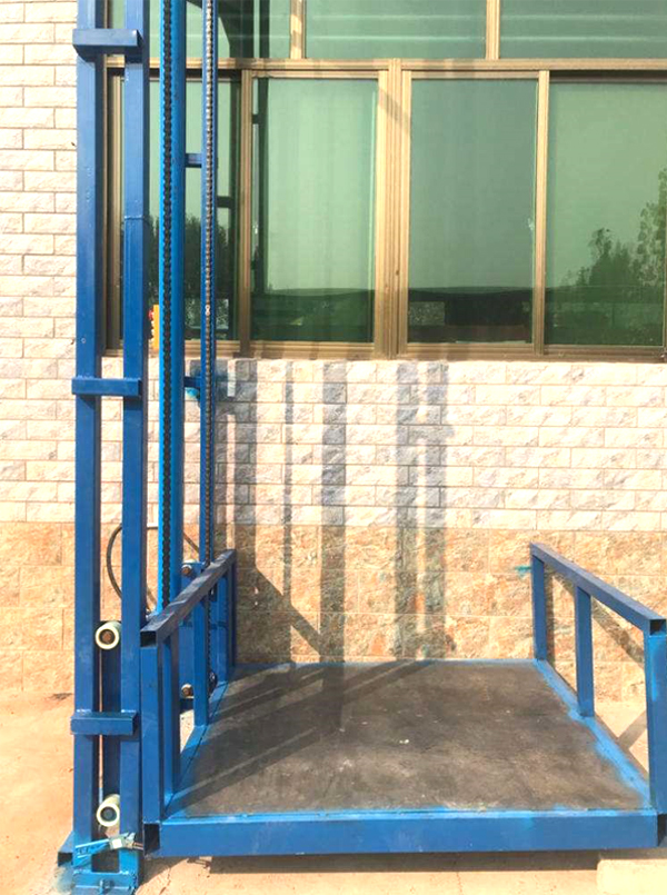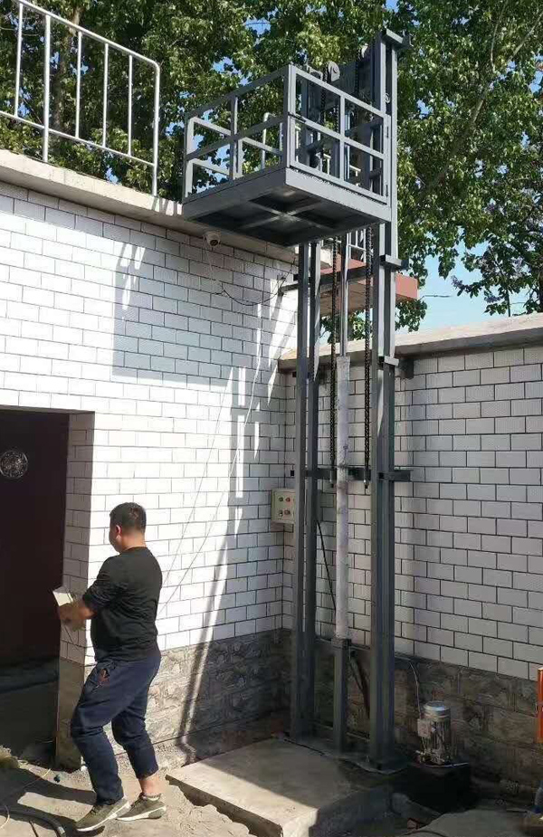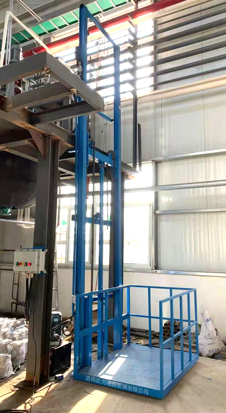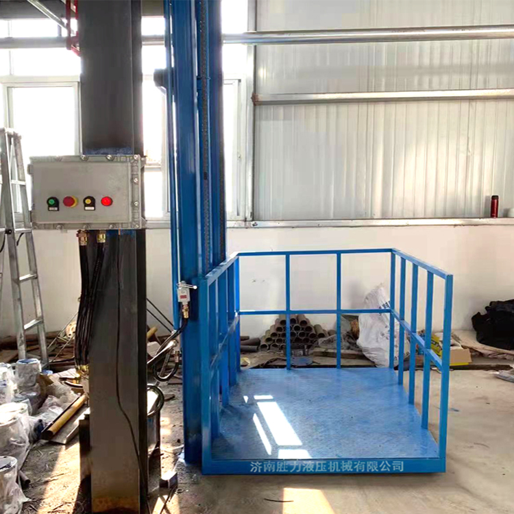 小型单轨式液压升降货梯是由导轨、台面、链条、油缸、泵站、控制系统等组合而成的一种常见的液压货梯。