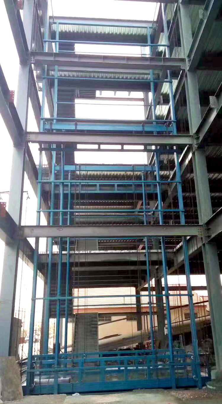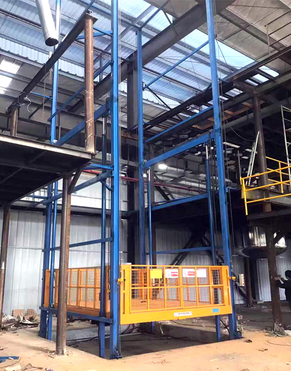 大吨位导轨式液压升降货梯是一种液压升降机械设备,可承重100吨,主要用于多层工业厂房、仓库、超市等楼层间的货物上下运输。