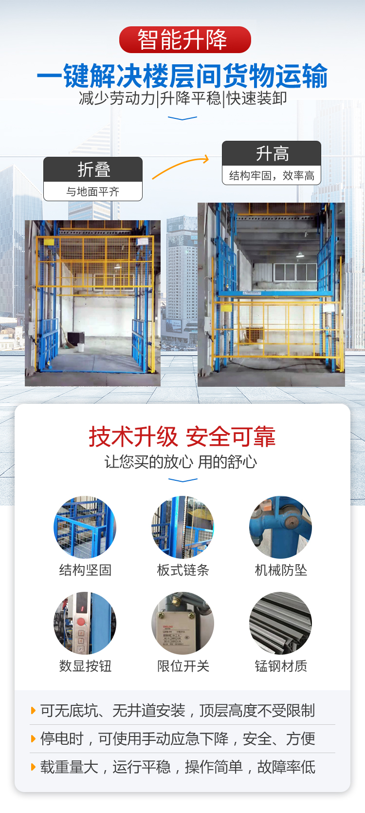 电动液压升降货梯安装不受限制,无需地坑和井道,产品结构坚固,载重量大,升降平稳,安装维护简单方便,是经济实用的低楼层间替代电梯的理想货物输送设备。