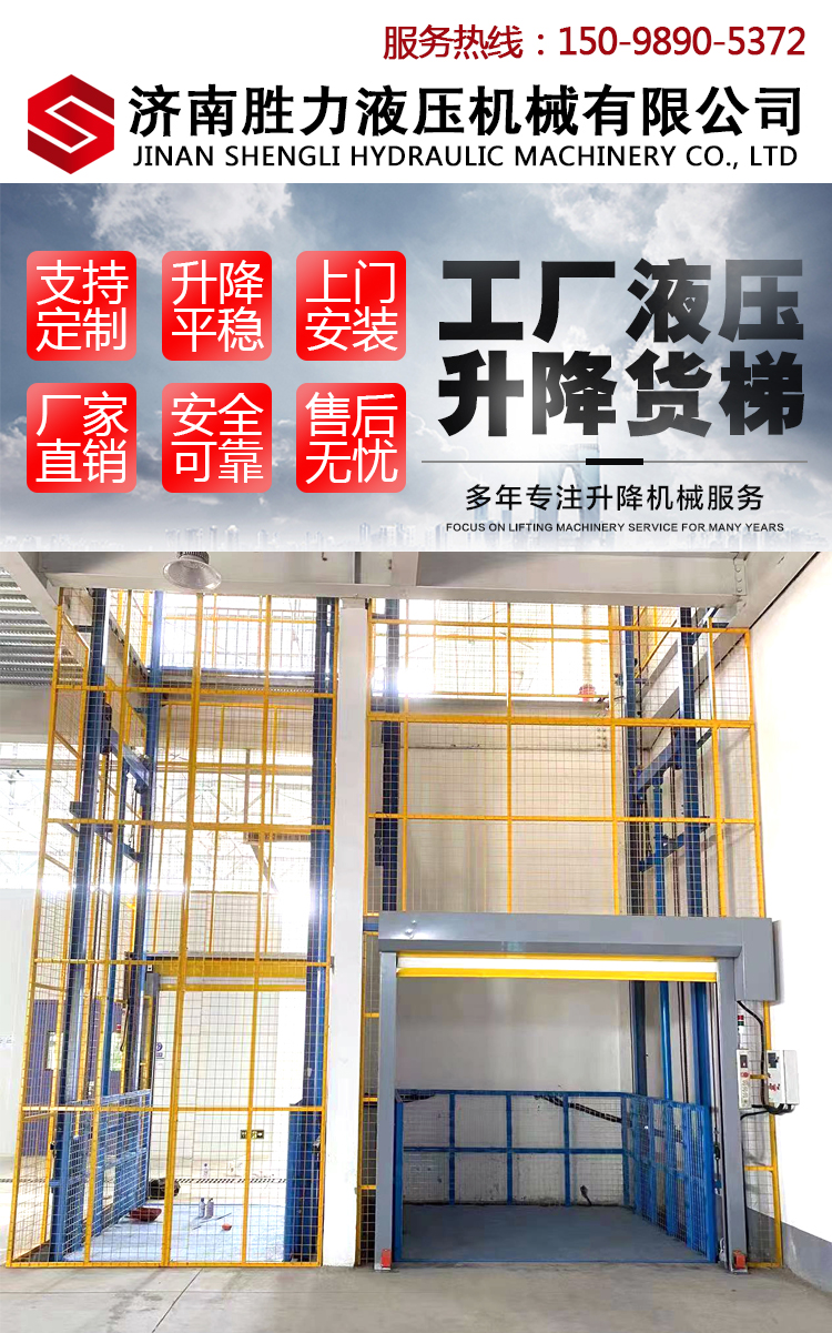 工厂液压升降货梯的安装不受限制,无需地坑和井道,产品结构坚固,载重量大,升降平稳,安装维护简单方便,是经济实用的低楼层间替代电梯的理想货物输送设备。